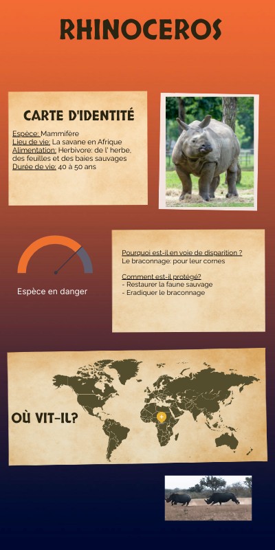 Pourquoi est-il en voie de disparition ? Le braconnage: pour leur cornes Comment est-il protégé? - Restaurer la faune sauvage - Eradiquer le braconnage