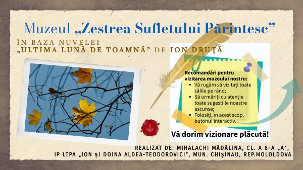 Excursia noastră a luat sfârșitMulțumim pentru vizitarea Muzeului „Zestrea sufletului părintesc”