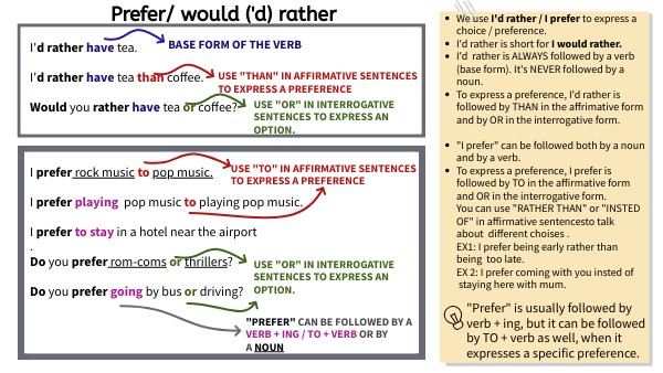 - To express a preference, I prefer is followed by TO in the affirmative form and OR in the interrogative form.