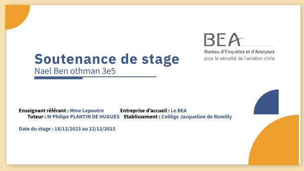 Enseignant référant : Mme Lepoutre Entreprise d’accueil : Le BEA Tuteur : M Philipe PLANTIN DE HUGUES Etablissement : Collège Jacqueline de Romilly Date du stage : 18/12/2023 au 22/12/2023