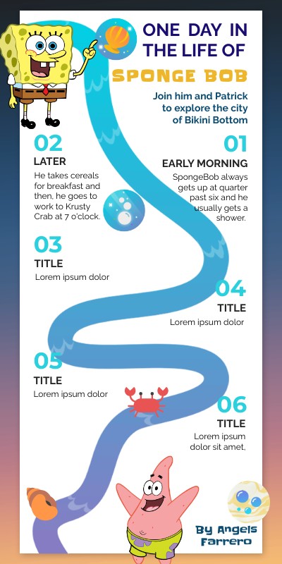 He takes cereals for breakfast and then, he goes to work to Krusty Crab at 7 o'clock.