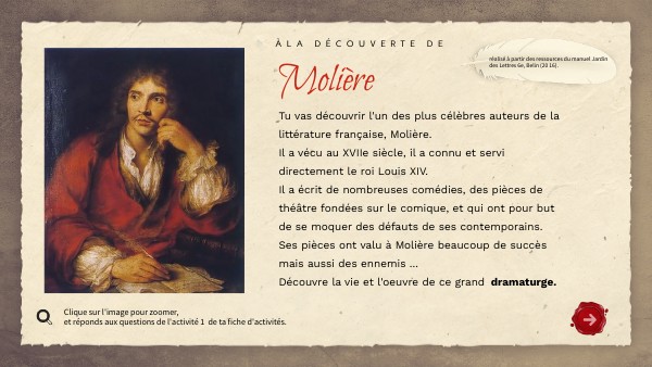 Tu vas découvrir l'un des plus célèbres auteurs de la littérature française, Molière. Il a vécu au XVIIe siècle, il a connu et servi directement le roi Louis XIV. Il a écrit de nombreuses comédies, des pièces de théâtre fondées sur le comique, et qui ont pour but de se moquer des défauts de ses contemporains. Ses pièces ont valu à Molière beaucoup de succès mais aussi des ennemis ... Découvre la vie et l'oeuvre de ce grand