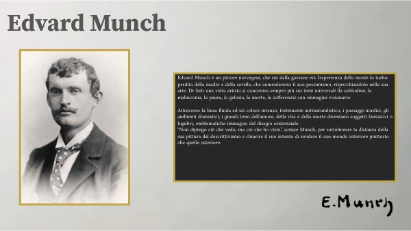 Edvard Munch è un pittore norvegese, che sin dalla giovane età l'esperienza della morte lo turba: perdita della madre e della sorella, che aumentarono il suo pessimismo, rispecchiandolo nella sua arte. Di fatti una volta artista si concentra sempre più sui temi universali (la solitudine, la malinconia, la paura, la gelosia, la morte, la sofferenza) con immagini visionarie.Attraverso la linea fluida ed un colore intenso, fortemente antinaturalistico, i paesaggi nordici, gli ambienti domestici, i grandi temi dell'amore, della vita e della morte diventano soggetti fantastici o lugubri, emblematiche immagini del disagio esistenziale."Non dipingo ciò che vedo, ma ciò che ho visto", scrisse Munch, per sottolineare la distanza della sua pittura dal descrittivismo e chiarire il suo intento di rendere il suo mondo interiore piuttosto che quello esteriore.