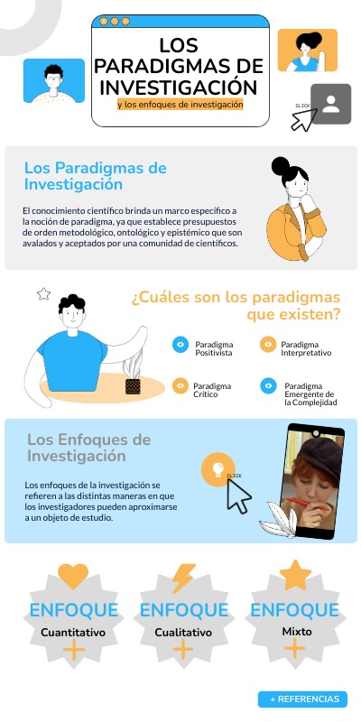 Infografia sobre los paradigmas positivista, interpretativo, crítico, y emergente de la complejidad. Además, los tres enfoques de investigación: cuantitativo, cualitativo y mixto.