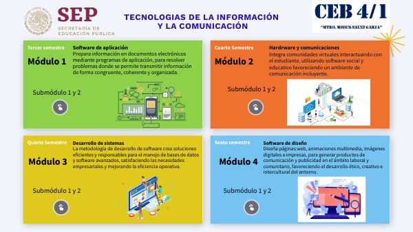 La enseñanza se estructura en cuatro módulos que abarcan desde el manejo de aplicaciones de oficina hasta el desarrollo de sistemas y diseño de software, preparando a los alumnos para roles en áreas administrativas, soporte técnico, sistemas, publicidad, entre otros.