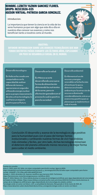 Fuentes de consulta: Ansa, A. (2023, junio 10). Italia, con súper computador para fusión nuclear. Agencia ANSA. https://ansabrasil.com.br/americalatina/noticia/ciencia_y_tecnologia/2023/06/10/italia-super-computador-para-fusion-nuclear_81b4ef87-c701-43ba-a456-db5cda96f336.html Estrada, L. (2023, diciembre 22). Avances científicos que marcaron 2023. TecScience. https://tecscience.tec.mx/es/tecnologia/avances-cientificos-2023/ Mozur, P. (2024, febrero 21). China intenta dominar el campo de la Inteligencia Artificial, pero sigue dependiendo de la tecnología de Estados Unidos. infobae. https://www.infobae.com/america/the-new-york-times/2024/02/21/china-intenta-dominar-el-campo-de-la-inteligencia-artificial-pero-sigue-dependiendo-de-la-tecnologia-de-estados-unidos/ Tecnología verde: un sector con futuro. (s/f). La actualidad de Alemania. Recuperado el 18 de marzo de 2024, de https://www.tatsachen-ueber-deutschland.de/es/clima-y-energia/tecnologia-verde-un-sector-con-futuro