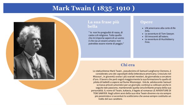 Lo statiunitense Mark Twain , pseudonimo di Samuel Langhorne Clemens, è considerato uno dei capostipiti della letteratura americana. Cresciuto nel Missouri , in gioventù svolse i più svariati mestieri, da giornalista a cercatore d'oro. Il lavoro che però segnò maggiormente la sua formazione fu quello di pilota di battelli a vapore sul fiume Mississippi. Già da adolescente Samuel scriveva articoli umoristici per un giornale; continuò a coltivare anche in seguito tale passione, mantenendo quella vena brillante propia della sua personalità. IL nome di Twain, tuttavia, è legato al romanzo LE AVVENTURE DI TOM SAWYER. Negli ultimi anni della sua vitra Twain divenne via via sempre più pessimista e si accentuò lo scetticismo che aveva sempre costituito un tratto del suo carattere.