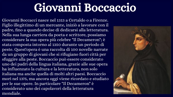 Giovanni Boccacci nasce nel 1313 a Certaldo o a Firenze. Figlio illegittimo di un mercante, iniziò a lavorare con il padre, fino a quando decise di dedicarsi alla letteratura. Nella sua lunga carriera da poeta e scrittore, possiamo considerare la sua opera più celebre "Il Decameron"; è stata composta intorno al 1350 durante un periodo di peste. Quest'opera è una raccolta di 100 novelle narrate da un gruppo di giovani che si rifugiano fuori città per sfuggire alla peste. Boccaccio può essere considerato uno dei padri della lingua italiana, grazie alle sue opera ha influenzato la cultura e la letteratura, non solo italiana ma anche quella di molti altri paesi. Boccaccio morì nel 1375, ma ancora oggi viene ricordato e studiato per le sue opere. In particolare "Il Decameron" è considerato uno dei capolavori della letteratura mondiale.