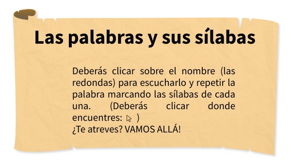 Deberás clicar sobre el nombre (las redondas) para escucharlo y repetir la palabra marcando las sílabas de cada una. (Deberás clicar donde encuentres: ) ¿Te atreves? VAMOS ALLÁ!