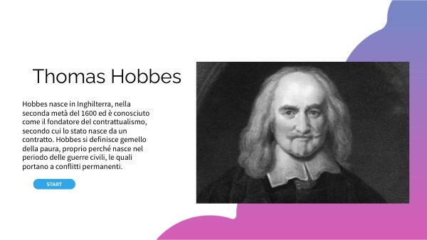 Hobbes nasce in Inghilterra, nella seconda metà del 1600 ed è conosciuto come il fondatore del contrattualismo, secondo cui lo stato nasce da un contratto. Hobbes si definisce gemello della paura, proprio perché nasce nel periodo delle guerre civili, le quali portano a conflitti permanenti.
