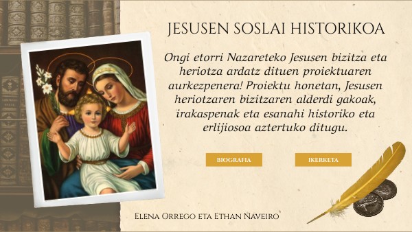 Ongi etorri Nazareteko Jesusen bizitza eta heriotza ardatz dituen proiektuaren aurkezpenera! Proiektu honetan, Jesusen heriotzaren bizitzaren alderdi gakoak, irakaspenak eta esanahi historiko eta erlijiosoa aztertuko ditugu.