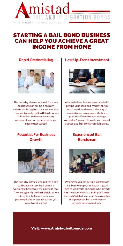 If you are searching for a bail bondsman near me, Amistad is your one-stop destination. In this infographic, we describe how starting a bail bond business can help you achieve a great income from home. For more information, visit our website: https://www.amistadbailbonds.com/