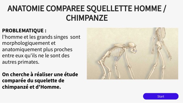 PROBLEMATIQUE : l'homme et les grands singes sont morphologiquement et anatomiquement plus proches entre eux qu'ils ne le sont des autres primates. On cherche à réaliser une étude comparée du squelette de chimpanzé et d'Homme.