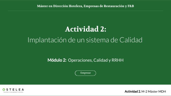 Eres el director/a del establecimiento y desde la propiedad de la empresa se ha tomado la decisión de implantar un Sistema de Calidad Total que permita al hotel diferenciarse de sus competidores de la zona y adquirir así una ventaja competitiva. Uno de tus primeros encargos es presentar a la dirección de la empresa un plan de implementación del sistema de Calidad.