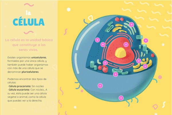 Existen organismos unicelulares, formados por una única célula, y también puede haber organismos con más de una célula que se denominan pluricelulares.Podemos encontrar dos tipos de células: · Célula procariota: Sin núcleo · Célula eucariota: Con núcleo,. A su vez, ésta puede ser una célula vegetal o animal, como la célula que puedes ver a la derecha.