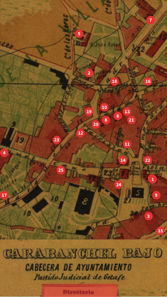 FÁBRICAS Y COMERCIOS EN EL CASCO HISTÓRICO DE CARABANCHEL BAJO A FINALES DEL SIGLO XIX 1. Matadero municipal 2. Fábrica de electricidad de los Carabancheles 3. Fábrica de curtidos de Esteban Salaberry 4. Fábrica de cerillas de Alejandro Sánchez 5. Fábrica de hielo artificial “La Favorita” 6. Fábrica de jabón de Romero y Sánchez 7. Fábrica de pasta para sopas de hijo sucesor de Diego Romero 8. Coloniales de hijo sucesor de Diego Romero 9. Fábrica de jabón de sucesor de Yarritu 10. Fábrica de jabón y coloniales de Muñoz Vargas hermanos/ José María Muñoz 11. Peluquería y Barbería de Manuel Sastre 12. Agencia Funeraria La Paz 13. Hojalatería de Manuel García e Hijo 14. Café Restaurant de Santiago González 15. Fundidores de campanas Constantino Linares y hermanos 16. Marmolista y lapidario Filiberto Cristobal 17. Tahona de la Magdalena de Juan Rodríguez 18. Gran Café Restaurant de Vista Alegre de Don Mariano Bernard 19. Almacén de frutos coloniales y peninsulares de Casimiro Escudero 20. Tahona de Santa Teresa de Ramón López 21. Confitería y repostería de Manuel Garciacaro 22. Taller de encuadernación de Pastor y Martín 23. Fábrica de embutidos de León Acera 24. Ultramarinos La Favorita 25. Panera La Ideal