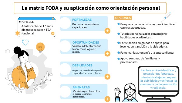 A través de esta actividad podrás profundizar en el concepto de la orientación educativa y vocacional, sus características y abordar los recursos necesarios para facilitar el paso a la vida adulta y laboral desde la técnica de la matriz FODA.