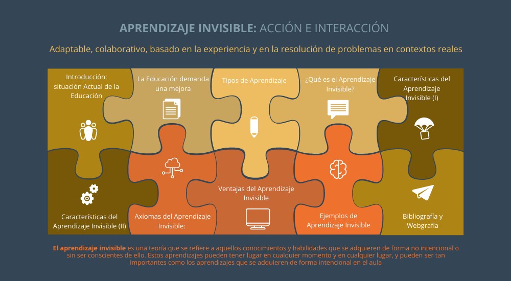El aprendizaje invisible es una teoría que se refiere a aquellos conocimientos y habilidades que se adquieren de forma no intencional o sin ser conscientes de ello. Estos aprendizajes pueden tener lugar en cualquier momento y en cualquier lugar, y pueden ser tan importantes como los aprendizajes que se adquieren de forma intencional en el aula