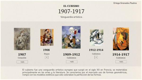 El cubismo fue un movimiento artístico desarrollado entre 1907 y 1917, creado por Pablo Picasso y Georges Braque. La característica más destacable del cubismo es que no solo representa la realidad a través de figuras geométricas, sino que fragmenta las líneas y las superficies, lo que se le conoce como perspectiva múltiple.