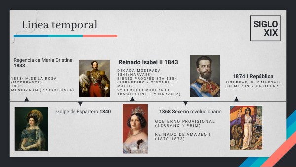 Decada moderada 1843(Narvaez)Bienio progresista 1854 (espartero y o´donell madoz 2º periodo moderado 1856(o´donell y narvaez)