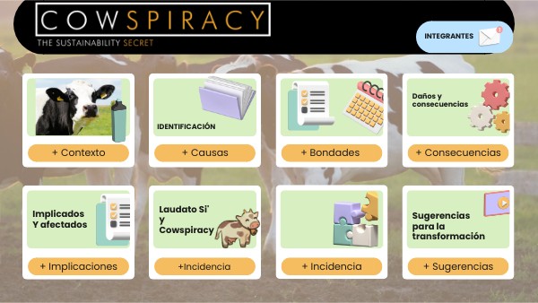 "''Cowspiracy”, un documental innovador dirigido por kip andersen y Keegan Kuhn y estreno en 2014, tiene como objetivo arrojar luz sobre las consecuencias medioambientales de la ganadería y la industria cárnica en los Estados Unidos. La investigación se puede comparar con un proceso de “causa- efecto” pues la causa es el consumo exacerbado que va acabando con el medio ambiente y el efecto debería ser la responsabilidad y toma de conciencia que debemos de desarrollar en relación con nuestro entorno. La ubicación espacio - tiempo preciso en las que se caracterizan las condiciones sociales, culturales, históricas y ambientales a lo largo de las últimas décadas especialmente en el siglo XXI.