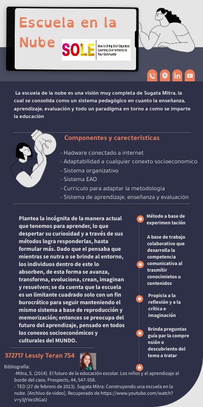 La escuela de la nube es una visión muy completa de Sugata Mitra, la cual se consolida como un sistema pedagógico en cuanto la enseñanza, aprendizaje, evaluación y todo un paradigma en torno a como se imparte la educación