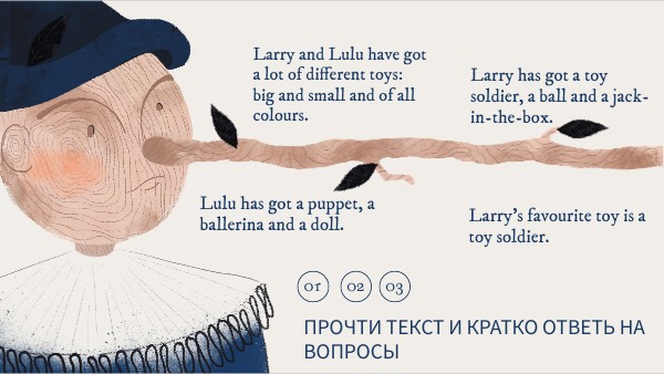 Larry and Lulu have got a lot of different toys: big and small and of all colours.