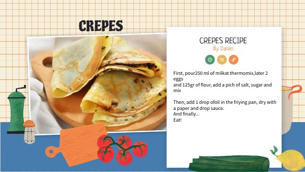 First, pour250 ml of milkat thermomix,later 2 eggs and 125gr of flour, add a pich of salt, sugar and mix Then, add 1 drop ofoil in the friying pan, dry with a paper and drop sauce. And finally... Eat!