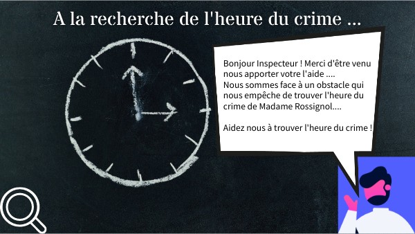 Bonjour Inspecteur ! Merci d'être venu nous apporter votre l'aide .... Nous sommes face à un obstacle qui nous empêche de trouver l'heure du crime de Madame Rossignol.... Aidez nous à trouver l'heure du crime !