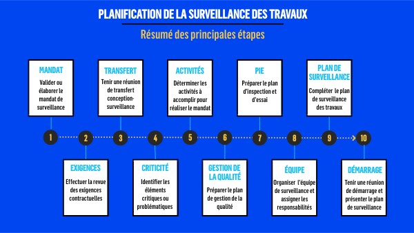 L'ingénieur.e responsable de la surveillance établit l'ensemble des activités d'inspection et de contrôle de la qualité des travaux et des matériaux. Il ou elle définit les paramètres de chacune de ces activités: