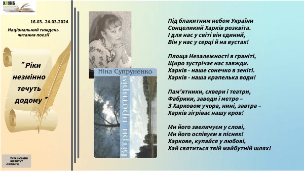 Під блакитним небом УкраїниСонцеликий Харків розквіта. І для нас у світі він єдиний, Він у нас у серці й на вустах! Площа Незалежності в граніті, Щиро зустрічає нас завжди. Харків - наше сонечко в зеніті. Харків - наша крапелька води! Пам'ятники, сквери і театри, Фабрики, заводи і метро – З Харковом учора, нині, завтра – Харків зігріває нашу кров! Ми його звеличуєм у слові, Ми його оспівуєм в піснях! Харкове, купайся у любові, Хай святиться твій майбутній шлях!