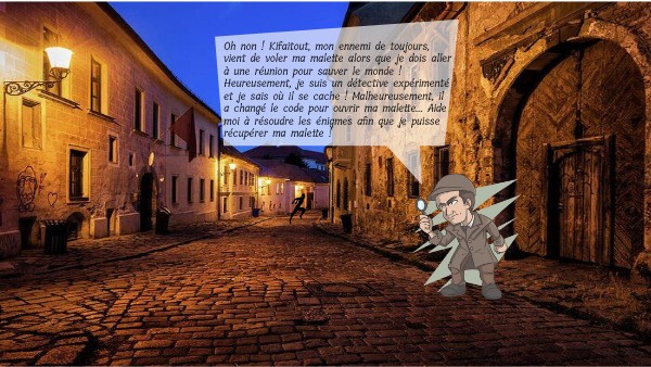 Oh non ! Kifaitout, mon ennemi de toujours, vient de voler ma malette alors que je dois aller à une réunion pour sauver le monde ! Heureusement, je suis un détective expérimenté et je sais où il se cache ! Malheureusement, il a changé le code pour ouvrir ma malette... Aide moi à résoudre les énigmes afin que je puisse récupérer ma malette !