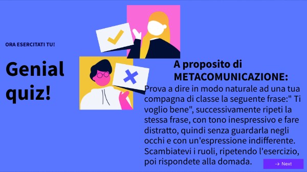 Prova a dire in modo naturale ad una tua compagna di classe la seguente frase:" Ti voglio bene", successivamente ripeti la stessa frase, con tono inespressivo e fare distratto, quindi senza guardarla negli occhi e con un'espressione indifferente. Scambiatevi i ruoli, ripetendo l'esercizio, poi rispondete alla domada.
