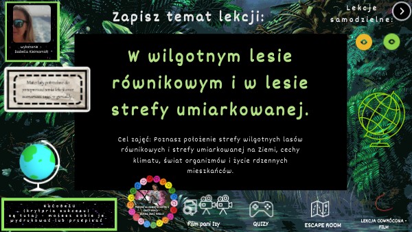 Cel zajęć: Poznasz położenie strefy wilgotnych lasów równikowych i strefy umiarkowanej na Ziemi, cechy klimatu, świat organizmów i życie rdzennych mieszkańców.