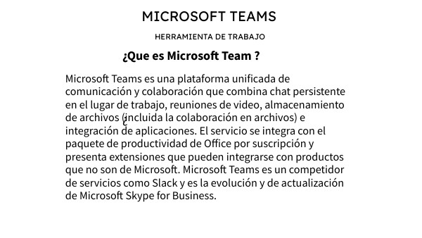 Microsoft Teams es una plataforma unificada de comunicación y colaboración que combina chat persistente en el lugar de trabajo, reuniones de video, almacenamiento de archivos (incluida la colaboración en archivos) e integración de aplicaciones. El servicio se integra con el paquete de productividad de Office por suscripción y presenta extensiones que pueden integrarse con productos que no son de Microsoft. Microsoft Teams es un competidor de servicios como Slack y es la evolución y de actualización de Microsoft Skype for Business.