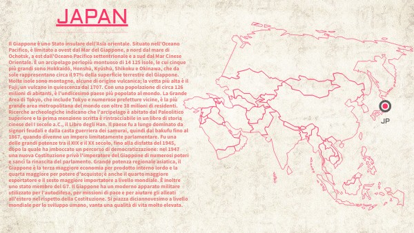 I primi abitanti del Giappone vennero, sia dalla Corea, sia dalla Cina del sud e dell'Asia sud-orientale, mescolandosi fra di loro e portando ciascuno un proprio contributo di conoscenze e esperienze. Gli Ainu, che ancora sopravvivono, sono gli Ebrei di una di queste popolazioni primitive, di stirpe asiatica ma non mongoloide. Attraverso la colonizzazione cinese in Giappone si diffuse il Confucianesimo e il Buddismo. Dalla Cina i Giapponesi ereditarono anche la scrittura, adattandola poi alla propria lingua. Le origini della letteratura giapponese, caratterizzate in ogni epoca da un vivo senso della natura e da una sottile indagine, risalgono al VIII sec. I primi testi sono due compilazioni a carattere mitico - storico (ereditato sia dal gergo parlato della popolazione giapponese e sia dalla lingua cinese). Per molti anni il Giappone ha avuto una struttura politica sociale molto simile a quella dell'Europa feudale. Al vertice, accanto a un imperatore del tutto privo di potere, un primo ministro che esercitava il governo effettivo al di sotto, una vera e propria rete di feudatari grandi e piccoli, che erano insieme guerrieri e proprietari terrieri. La Borghesia era molto debole e subordinata alla classe dei guerrieri. Anche questa società entrò in crisi nell'Ottocento al contatto con gli occidentali. Tuttavia il Giappone riuscì a mantenere la propria indipendenza ad avviare una propria rivoluzione industriale paragonabile a quella dell'Inghilterra aveva conosciuto un secolo prima. Fra la fine dell'Ottocento e l'inizio del novecento, il Giappone si trasformò in una grande potenza capitalista, e anche aggressiva in politica estera. Il Giappone con questa decisione andò all'attacco. Nel 1894-5 gli intrighi giapponesi in Corea provocano una guerra contro la Cina che rivela in modo clamoroso la superiorità militare nipponica. Con il trattato di Shimonoseki il Giappone ottiene Formosa e le isole Pescadores.storia del GiapponeIl Giappone con l'aiuto degli occidentali andò in Cina ad affrontare i Boxers. Nel 1902 c'è stata l'alleanza tra Giappone e Inghilterra e grazie a questa alleanza ci fu libera azione in Manciuria. In seguito ci fu la guerra tra Giappone e Russia, vinse il Giappone sia sulla terra sia in mare. Il Giappone partecipò anche alla Prima Guerra Mondiale, però non invase l'Asia, perché aveva di mira i possedimenti tedeschi in Cina e nel Pacifico. Nel 1923 ci fu un grave terremoto che gravò la situazione circostante in Giappone, questo terremoto diede molte "grane" ai giapponesi. Negli anni Trenta invase la Cina e durante la Seconda Guerra Mondiale si schierò a fianco dell'Italia e dalla Germania di Adolf Hitler, occupando militarmente buona parte dell'Asia orientale. Sconfitto gli alleati, conobbe anche, nel 1945, l'immane tragedia dello scoppio di due bombe atomiche una il 6 agosto a Hiroshima, la seconda il 9 agosto a Nagasaki. Subito dopo la guerra il Paese venne occupato dagli Americani e l'ordinamento politico si trasformò in monarchia costituzionale. Tuttavia, già a partire dagli anni Cinquanta, la sua economia si ricostruì fino a raggiungere e superare notevolmente i livelli dell'anteguerra.