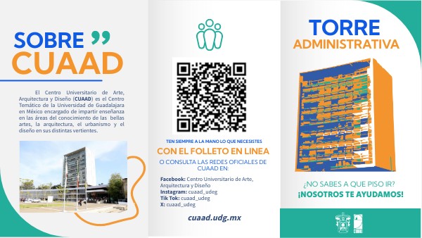 Facebook: Centro Universitario de Arte, Arquitectura y Diseño Instagram: cuaad_udeg Tik Tok: cuaad_udeg X: cuaad_udeg