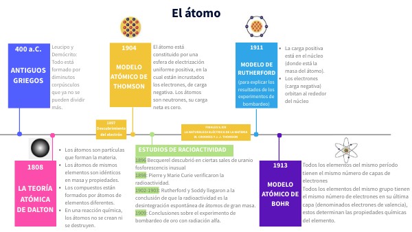 1896 Becquerel descubrió en ciertas sales de uranio fosforescencis inusual1898: Pierre y Marie Curie verificaron la radioactividad.1902-1903: Rutherford y Soddy llegaron a la conclusión de que la radioactividad es la desintegración espontánea de átomos de gran masa. 1909: Conclusiones sobre el experimento de bombardeo de oro con radiación alfa.