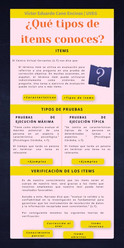 El Centro Virtual Cervantes (s.f) nos dice que: El término item se utiliza en evaluación para referirse a una pregunta en una prueba de corrección objetiva. En muchas ocasiones, en español, el término item puede utilizarse indistintamente como sinónimo de pregunta. Una tarea o ejercicio de evaluación puede incluír uno o más items.
