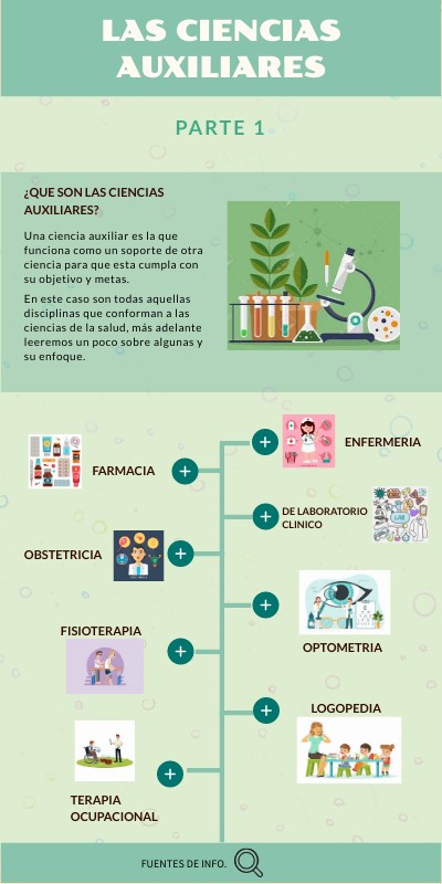 Una ciencia auxiliar es la que funciona como un soporte de otra ciencia para que esta cumpla con su objetivo y metas. En este caso son todas aquellas disciplinas que conforman a las ciencias de la salud, más adelante leeremos un poco sobre algunas y su enfoque.