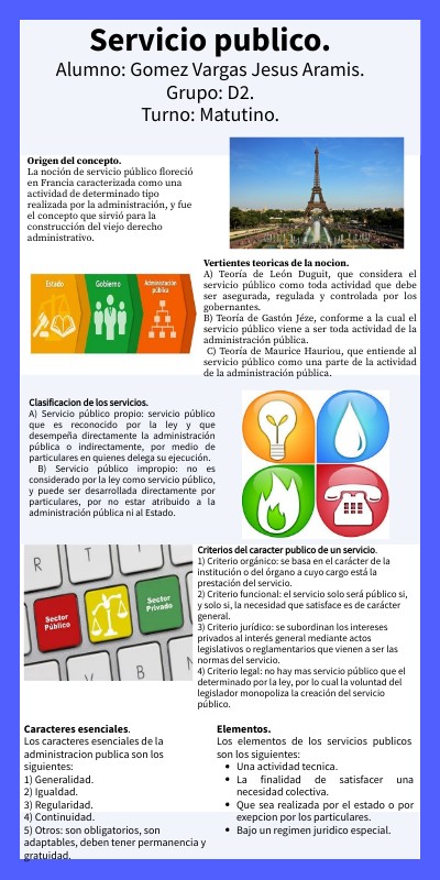 Criterios del caracter publico de un servicio.1) Criterio orgánico: se basa en el carácter de la institución o del órgano a cuyo cargo está la prestación del servicio. 2) Criterio funcional: el servicio solo será público si, y solo si, la necesidad que satisface es de carácter general. 3) Criterio jurídico: se subordinan los intereses privados al interés general mediante actos legislativos o reglamentarios que vienen a ser las normas del servicio. 4) Criterio legal: no hay mas servicio público que el determinado por la ley, por lo cual la voluntad del legislador monopoliza la creación del servicio público.