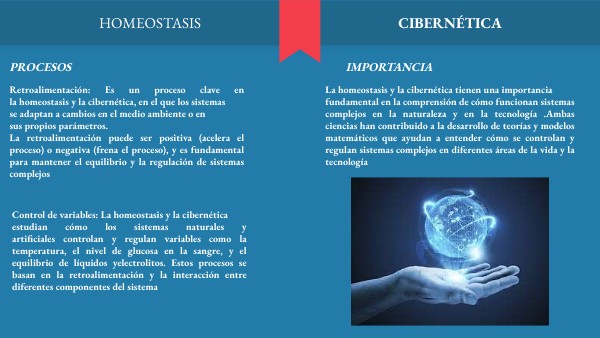 Control de variables: La homeostasis y la cibernética estudian cómo los sistemas naturales y artificiales controlan y regulan variables como la temperatura, el nivel de glucosa en la sangre, y el equilibrio de líquidos yelectrolitos. Estos procesos se basan en la retroalimentación y la interacción entre diferentes componentes del sistema
