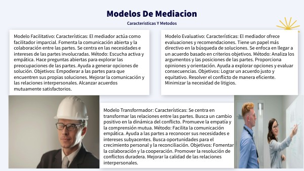 Modelo Evaluativo: Características: El mediador ofrece evaluaciones y recomendaciones. Tiene un papel más directivo en la búsqueda de soluciones. Se enfoca en llegar a un acuerdo basado en criterios objetivos. Método: Analiza los argumentos y las posiciones de las partes. Proporciona opiniones y orientación. Ayuda a explorar opciones y evaluar consecuencias. Objetivos: Lograr un acuerdo justo y equitativo. Resolver el conflicto de manera eficiente. Minimizar la necesidad de litigios.