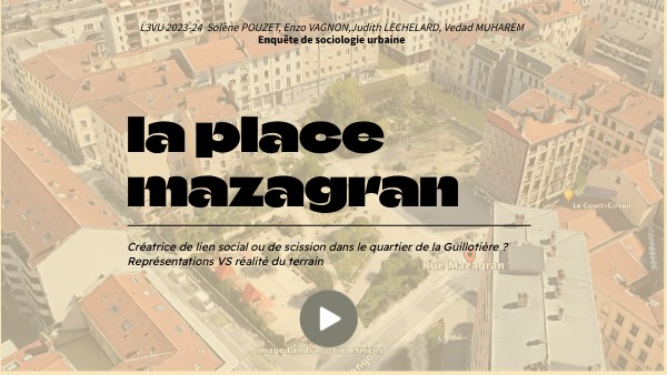 La place Mazagran est une place publique ouverte offrant la possibilité de se rencontrer, socialiser et passer du temps. C'est un lieu de vie sociale et de convivialité à part entière. En ce qui concerne le place Mazagran et le quartier de la Guillotière, on retrouve le phénomène de gentrification qui selon Donzelot dans son texte "Les villes à trois vitesses", est le "processus qui permet de jouir des avantages de la villes […] génère un produit qui a un prix, financier, propre à attirer ceux qui ont les moyens de se l'offrir et à faire disparaître de sa scène, discrètement, ceux qui ne le peuvent pas". Donzelot évoque le terme "d'entre-soi sélectif" que produit la gentrification, parlant ici de la population habitant ces espaces gentrifiés tels que les cadres, les professions intellectuelles supérieurs par exemple. Toujours dans son texte, les espaces gentrifiés seraient idéal pour les personnes dotée d'un "état esprit global". Un territoire à vocation "globale", comme l'explique Donzelot, se caractérise par la présence de "tout ce qui facilite un style de vie ou émergent les cafés et restaurants du monde entier, boutiques et galeries d'art (comme c'est le cas sur la place Mazagran). "Soit un ensemble de signes de prestige que les promoteurs ont appris à manier pour conférer à certains lieu cette marque du "global". Bien que le processus de gentrification soit bien présent, il ne semble cependant pas avoir les effets connus, du moins que partiellement. La hausse des loyers a bel et bien contraint a un déplacement forcé des classes sociales n'ayant plus les moyens de payer ces loyers, cependant dans notre zone d'étude, le processus ne semble pas avoir provoqué ce même déplacement des population immigrantes et pluriethniques. Le processus de gentrification ayant peut être qu'un effet sur les logements dans le sens le plus évident (habitats, loyers …) mais pas sur la "sociabilité de rues" dans laquelle des population s'approprient les rues et espaces publics où résident ces populations.