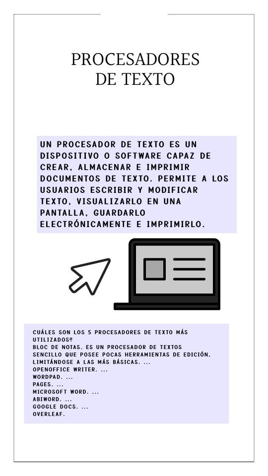 Un procesador de texto es un dispositivo o software capaz de crear, almacenar e imprimir documentos de texto. Permite a los usuarios escribir y modificar texto, visualizarlo en una pantalla, guardarlo electrónicamente e imprimirlo.