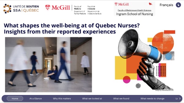 Nguyen, D. V. T., Bush, P. L., Lambert, S. D., & Salimi, D. (2026). What shapes the well-being of Quebec nurses? Insights from their reported experiences [Interactive presentation]. Genially. https://view.genially.com/65fadeb15953dd0014da5a52