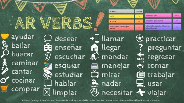 โAR Verb Conjugations Chat Matโ by Amanda Hadley is available under Creative Commons Attribution-ShareAlike license (CC BY-SA)