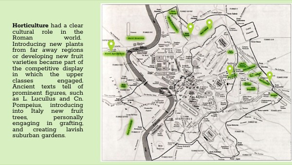Horticulture had a clear cultural role in the Roman world. Introducing new plants from far away regions or developing new fruit varieties became part of the competitive display in which the upper classes engaged. Ancient texts tell of prominent figures, such as L. Lucullus and Cn. Pompeius, introducing into Italy new fruit trees, personally engaging in grafting, and creating lavish suburban gardens.