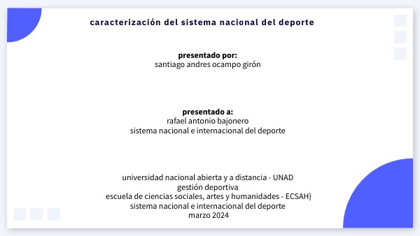 presentado por: santiago andres ocampo girón presentado a: rafael antonio bajonero sistema nacional e internacional del deporte universidad nacional abierta y a distancia - UNAD gestión deportiva escuela de ciencias sociales, artes y humanidades - ECSAH} sistema nacional e internacional del deporte marzo 2024