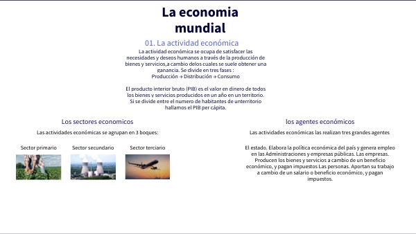La actividad económica se ocupa de satisfacer las necesidades y deseos humanos a través de la producción de bienes y servicios,a cambio delos cuales se suele obtener una ganancia. Se divide en tres fases : Producción → Distribución → Consumo El producto interior bruto (PIB) es el valor en dinero de todos los bienes y servicios producidos en un año en un territorio. Si se divide entre el numero de habitantes de unterritorio hallamos el PIB per cápita.